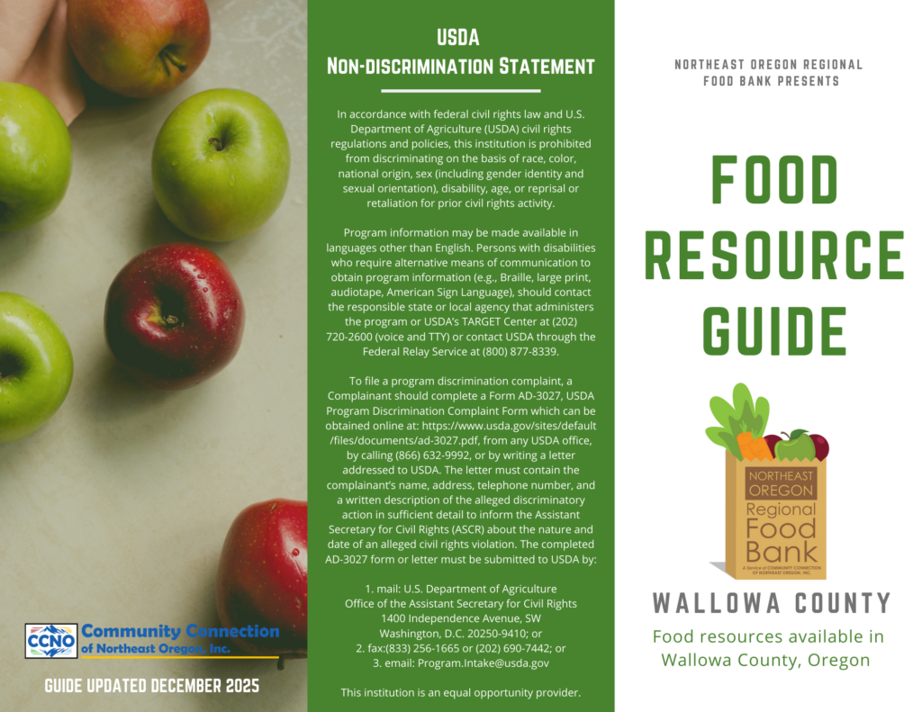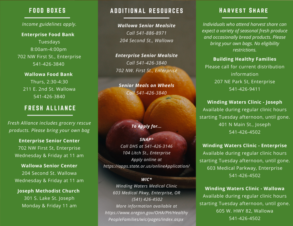 Wallowa County Food Resources include local food pantries, community meal sites, and emergency food assistance programs available throughout the county. These resources provide access to fresh and shelf-stable food for individuals, families, seniors, and households in need. Services vary by location and may include scheduled distribution days, eligibility guidelines, and contact information. Please review the listings shown for specific locations, hours of operation, and details for each food resource.
